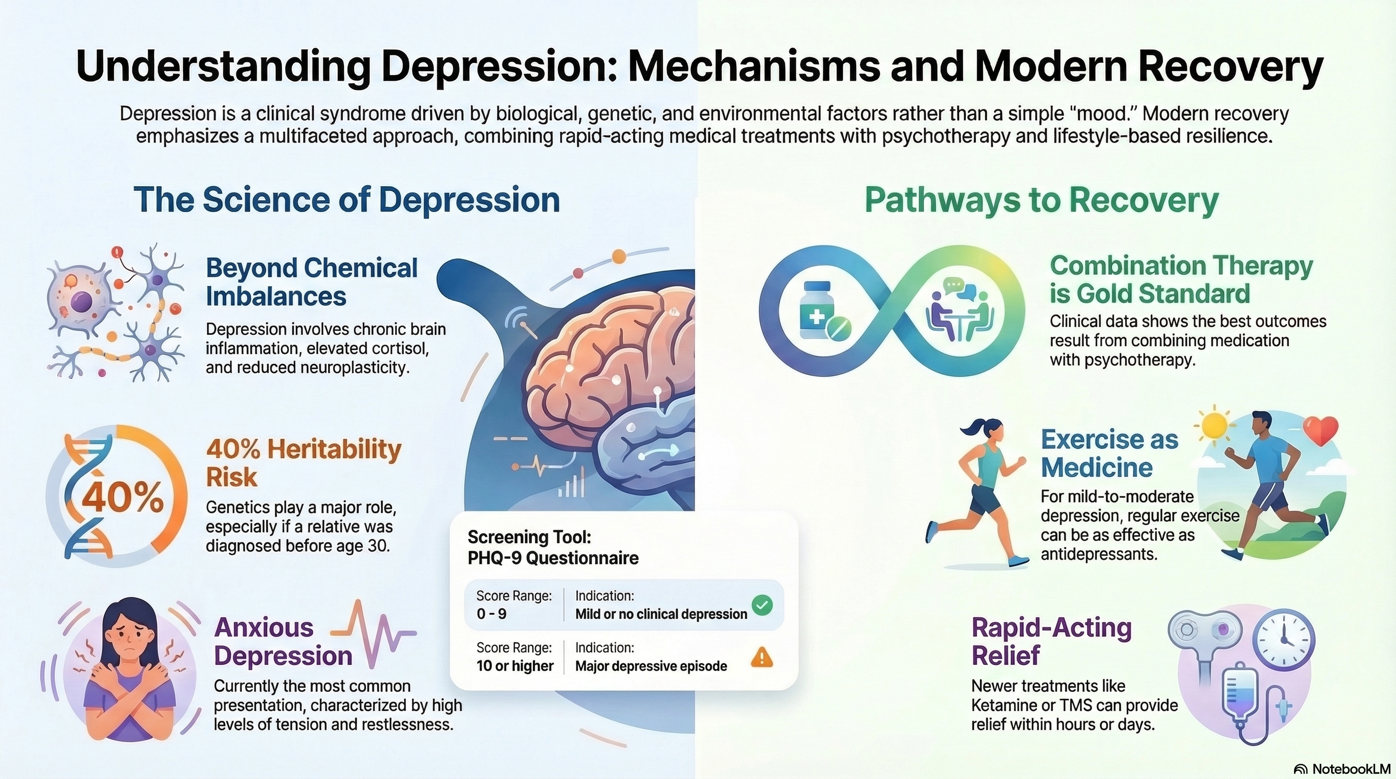 Biological Mechanisms: Research has moved beyond the "chemical imbalance" theory. We now know depression involves chronic low-grade brain inflammation, elevated stress hormones (cortisol), and reduced "neuroplasticity" (the brain's ability to repair and reorganize itself).